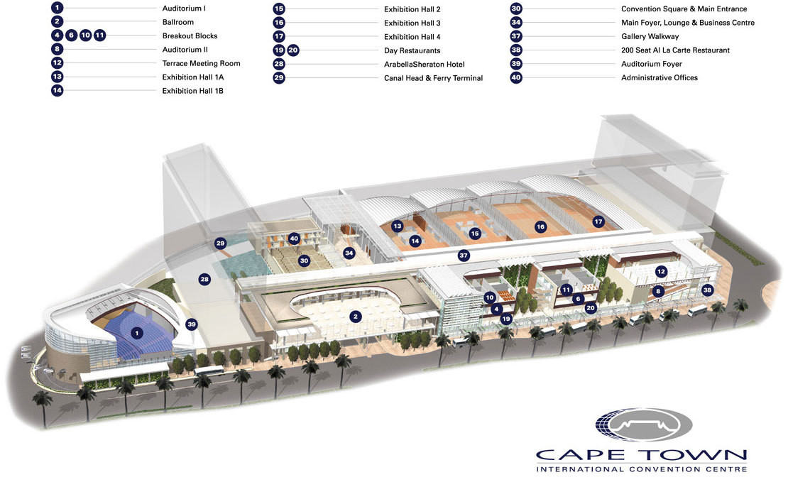 南非开普敦国际会议中心 CTICC位于南非开普敦中心商业区。南非开普敦国际会议中心 CTICC拥有展出面积11200平方米的展览空间及贸易展位, 南非开普敦国际会议中心 CTICC的主要门廊可通向会议中心广场,一个具大的阳台,从那里可眺望到Roggebaai运河和Arabella Sheraton大酒店。