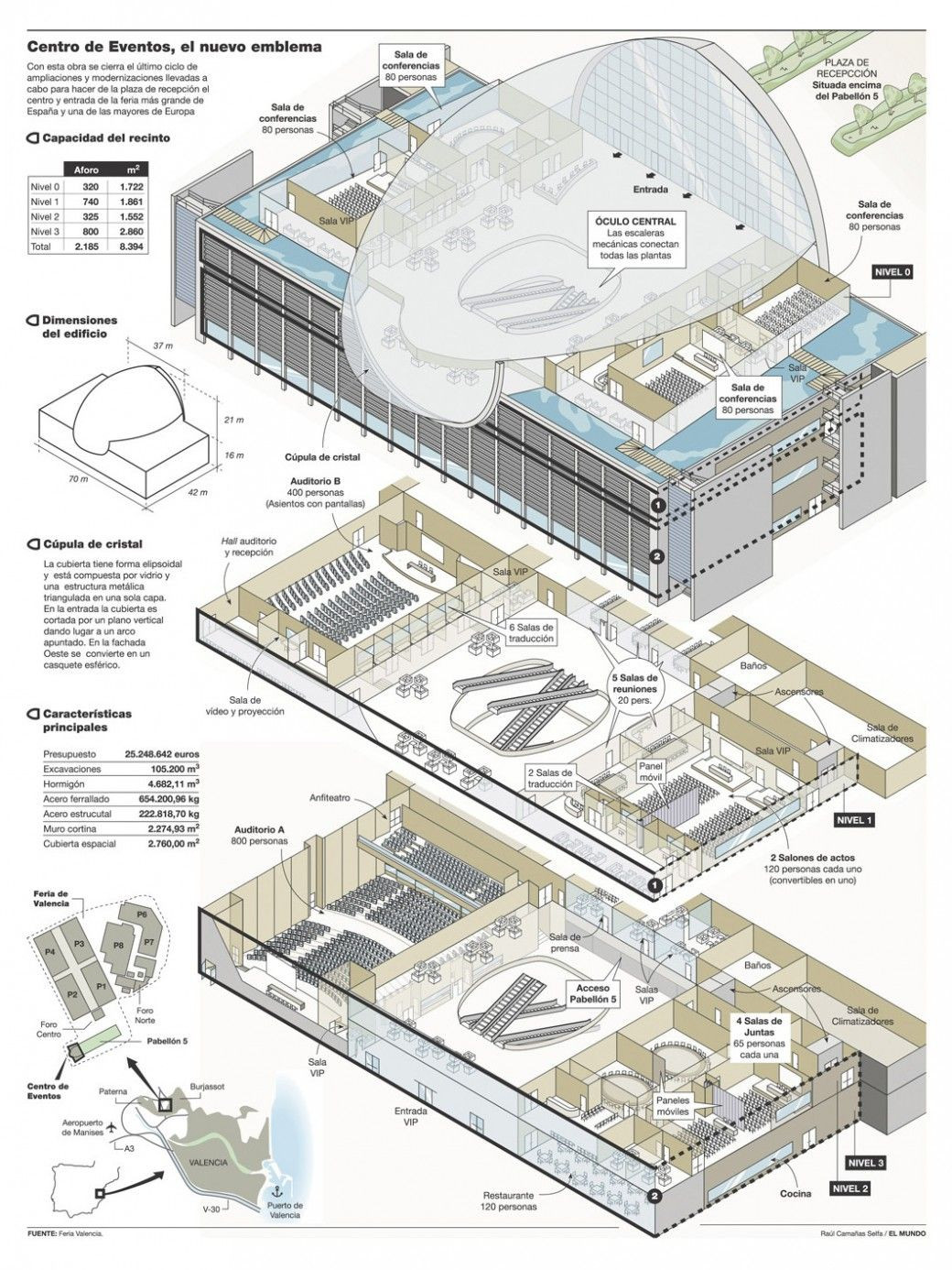 西班牙瓦伦西亚Ky开元集团中心 Feria Valencia建筑的规划功能包括四间会议室,每间都能容纳80人;两个大会议室,每间可容纳120人,还可合并成一个单一的空间,配备动态面板系统;一间容纳400人的礼堂和一间750人的礼堂(包括视听控制和同步翻译室);可容纳65人的会议室;以及新闻办公室、VIP房间、财政部、活动办公室和餐厅,还有五间20人规模的会议室、储藏室和洗手间。