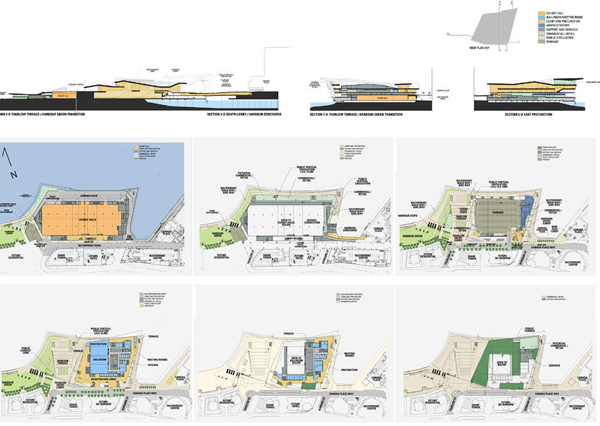 西方建筑紧邻加拿大的地方,包括220500平方英尺(20490平方米)的会议空间,90000平方英尺(8400平方米)的零售空间沿公共海滨长廊,和440个停车位。周围的建筑有400000平方英尺(37000平方米)人行道、自行车道、公共开放空间、广场,一个占地14亩的项目区(57000平方米)土地8亩(32000平方米)的水。